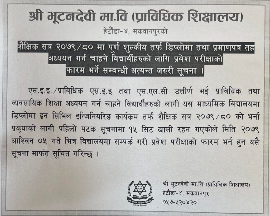 शैिक्षक सत्र २०७९/०८० मा पूर्ण शुल्कीय तर्फ Diploma In Engineering अध्ययन गर्न चाहेको विद्यार्थीको लागि प्रवेश परीक्षाको फारम भर्ने सम्बन्धी अत्त्यन्त जारी सूचना /