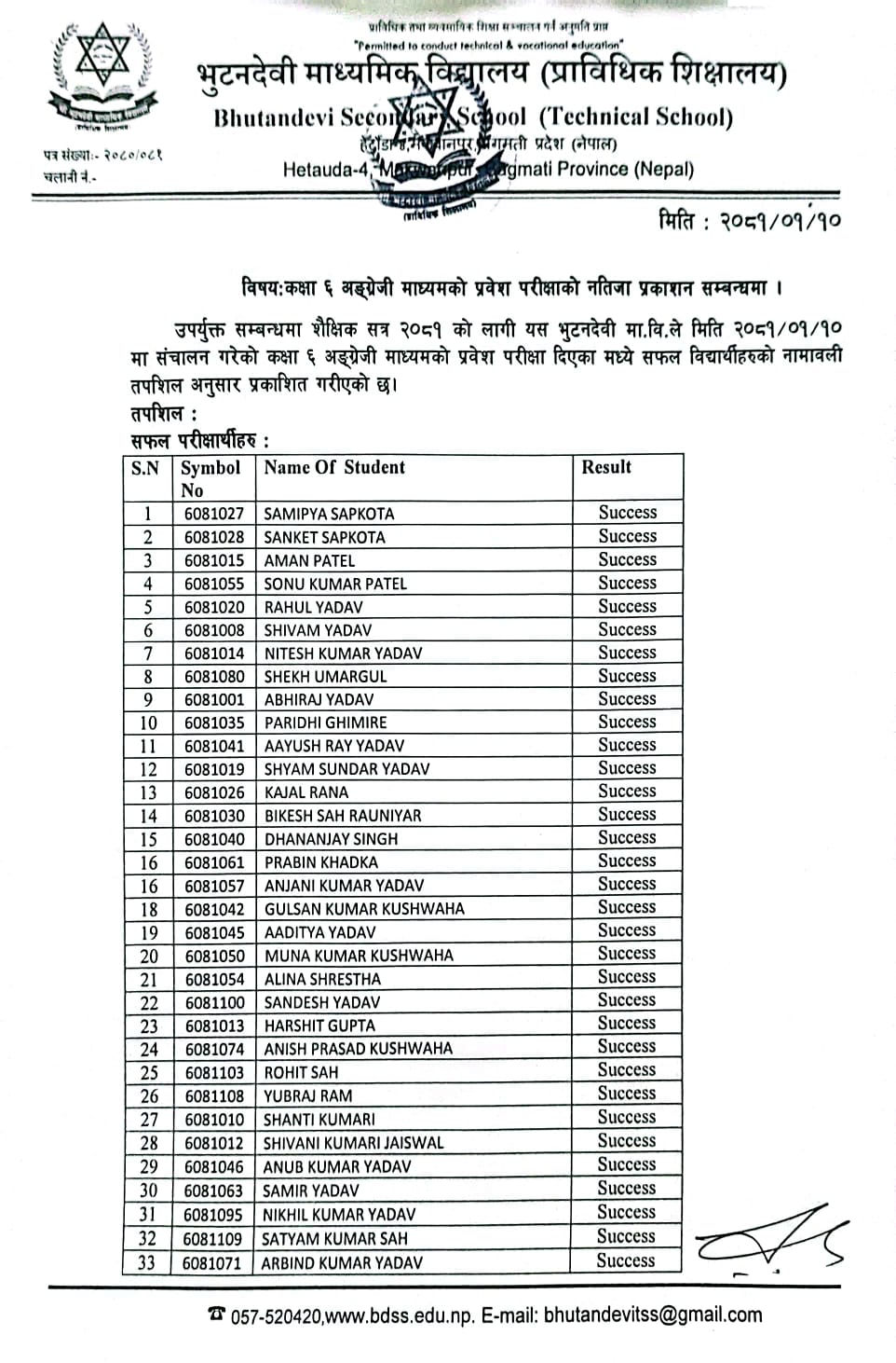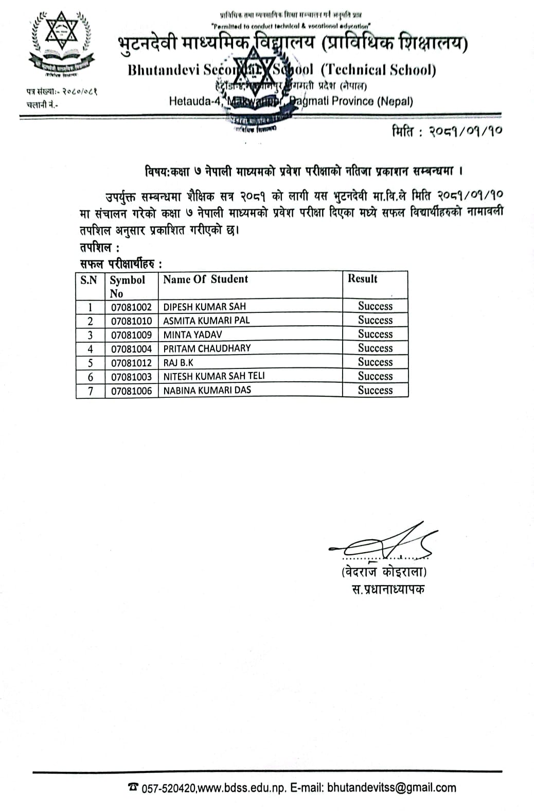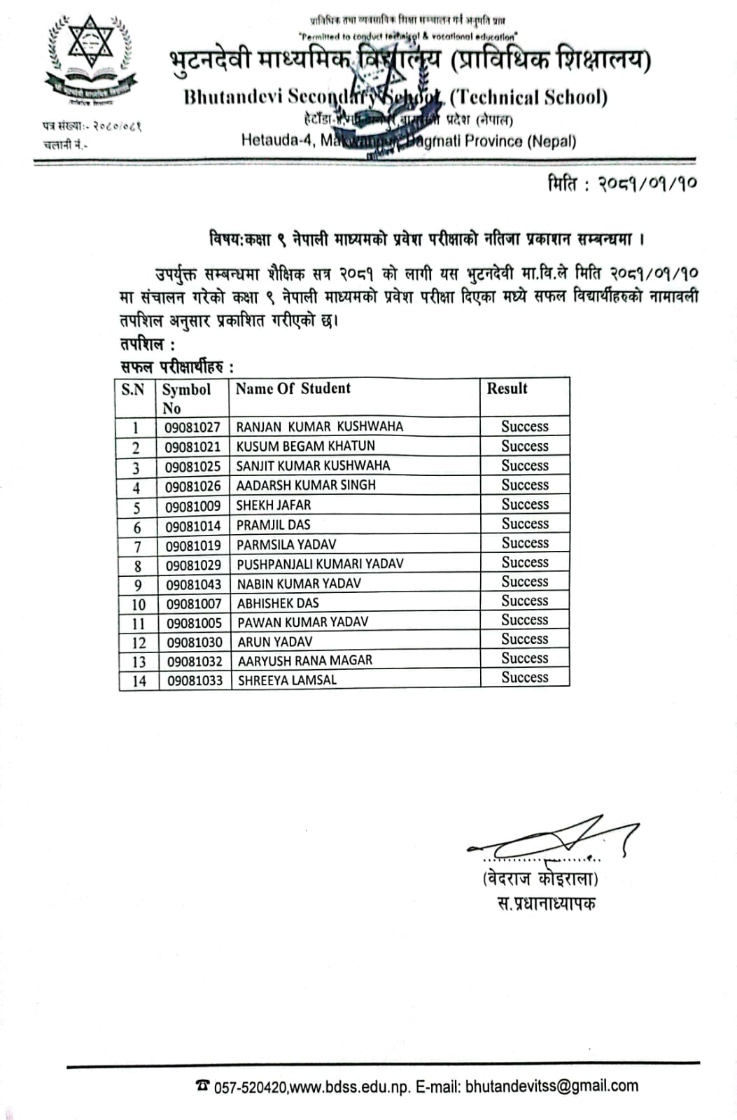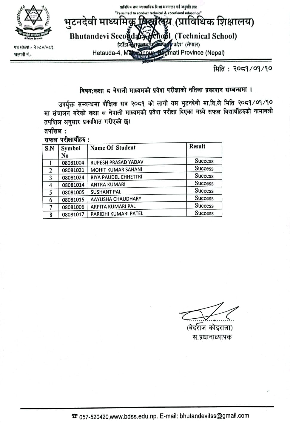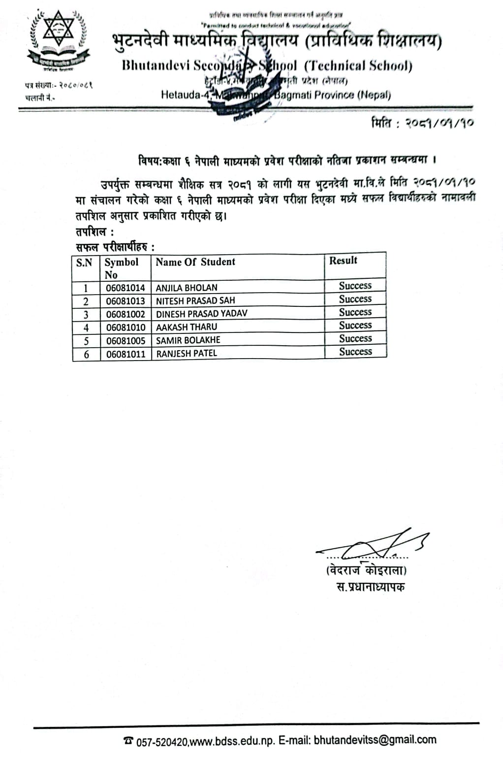 शै. स. २०८१ सालको प्रवेश परीक्षाको नतिजा प्रकाशित । FacebookTwitterPinterestWhatsApp कक्षा ५ (अंग्रेजी माध्यम) कक्षा ६ (नेपाली माध्यम) कक्षा ६ (अंग्रेजी माध्यम) कक्षा ७ (नेपाली माध्यम) कक्षा ७ (अंग्रेजी माध्यम) कक्षा ८ (नेपाली माध्यम) कक्षा ८ (अंग्रेजी माध्यम) कक्षा ९ (नेपाली माध्यम) कक्षा ९ (अंग्रेजी माध्यम) RELATED ARTICLESMORE FROM AUTHOR २४ महिने प्रि-डिप्लोमा औद्योगिक प्रशिक्षार्थी तालीम (Pre – Diploma Dual VET Apprenticeship) EARLY CHILDHOOD DEVELOPMENT FACILITATION को लागि भर्ना खुल्यो सूची दर्ता गर्ने सम्बन्धी सूचना। SEE नतिजा २०८१ नविन सिग्देल, अध्यक्ष, विद्यालय व्यवस्थापन समिति admin - August 4, 2020 माधवप्रसाद दहाल, प्राचार्य, भुटनदेवी माध्यमिक विद्यालय admin - June 4, 2020 योग्य तथा अनुभवि शिक्षकशिक्षिकाहरुद्धारा अध्यापन । admin - June 1, 2020 नियमित आवधिक परिक्षा सञ्चालन तालिका । admin - June 1, 2020 खेलकुद र अन्य सहक्रियाकलापको व्यवस्था । admin - June 1, 2020 कडा शैक्षिक गुणस्तर अनुशासन कायम । admin - June 1, 2020