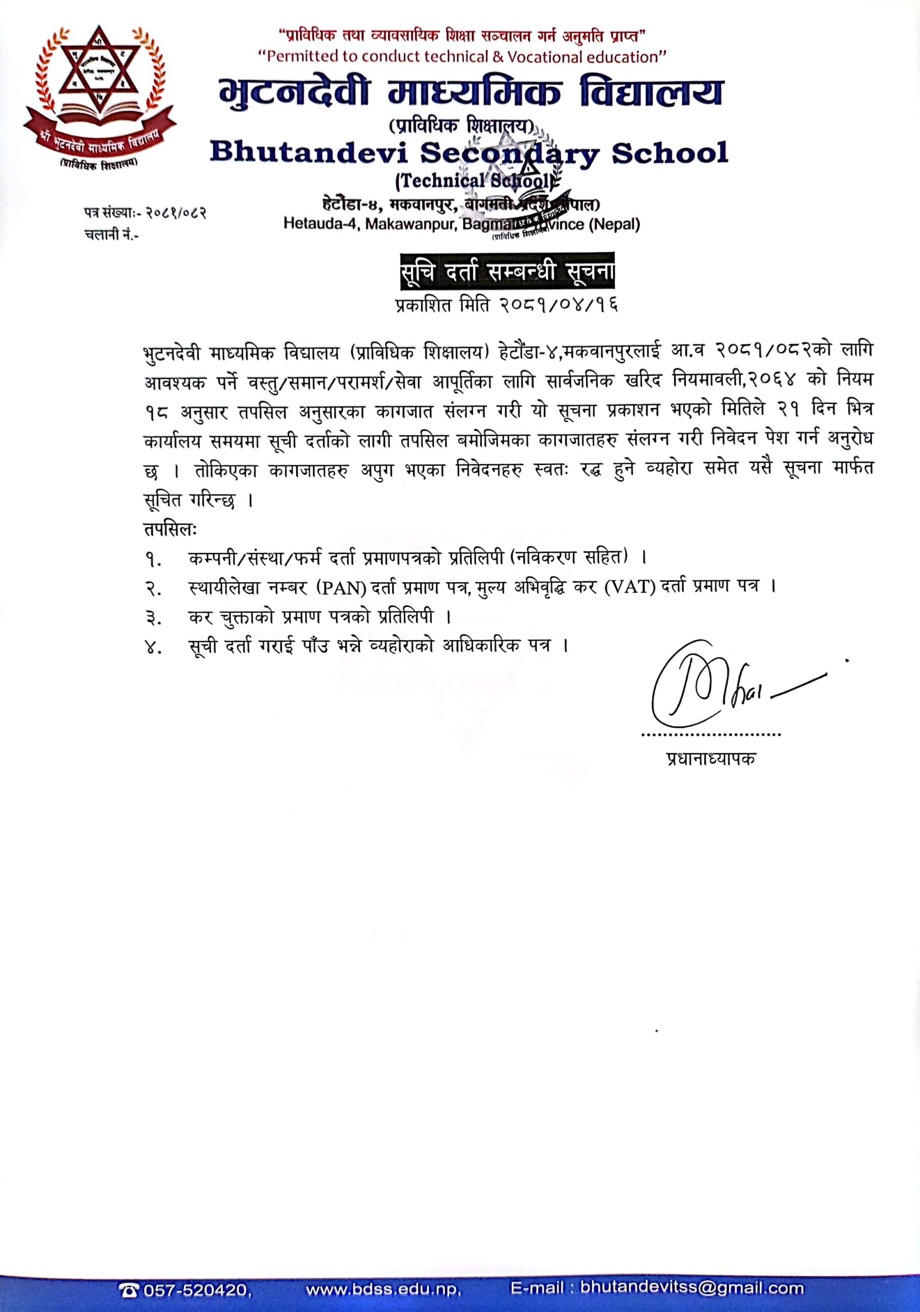 सूचि दर्ता सम्बन्धी सूचना FacebookTwitterPinterestWhatsApp RELATED ARTICLESMORE FROM AUTHOR स्थगन सम्बन्धी सूचना चमेनागृह संचालन कार्यको स्वीकृतिका लागि छनौट गर्ने आशयको सूचना आवश्यकता सम्बन्धी सूचना नविन सिग्देल, अध्यक्ष, विद्यालय व्यवस्थापन समिति admin - August 4, 2020 माधवप्रसाद दहाल, प्राचार्य, भुटनदेवी माध्यमिक विद्यालय admin - June 4, 2020 योग्य तथा अनुभवि शिक्षकशिक्षिकाहरुद्धारा अध्यापन । admin - June 1, 2020 नियमित आवधिक परिक्षा सञ्चालन तालिका । admin - June 1, 2020 खेलकुद र अन्य सहक्रियाकलापको व्यवस्था । admin - June 1, 2020 कडा शैक्षिक गुणस्तर अनुशासन कायम । admin - June 1, 2020