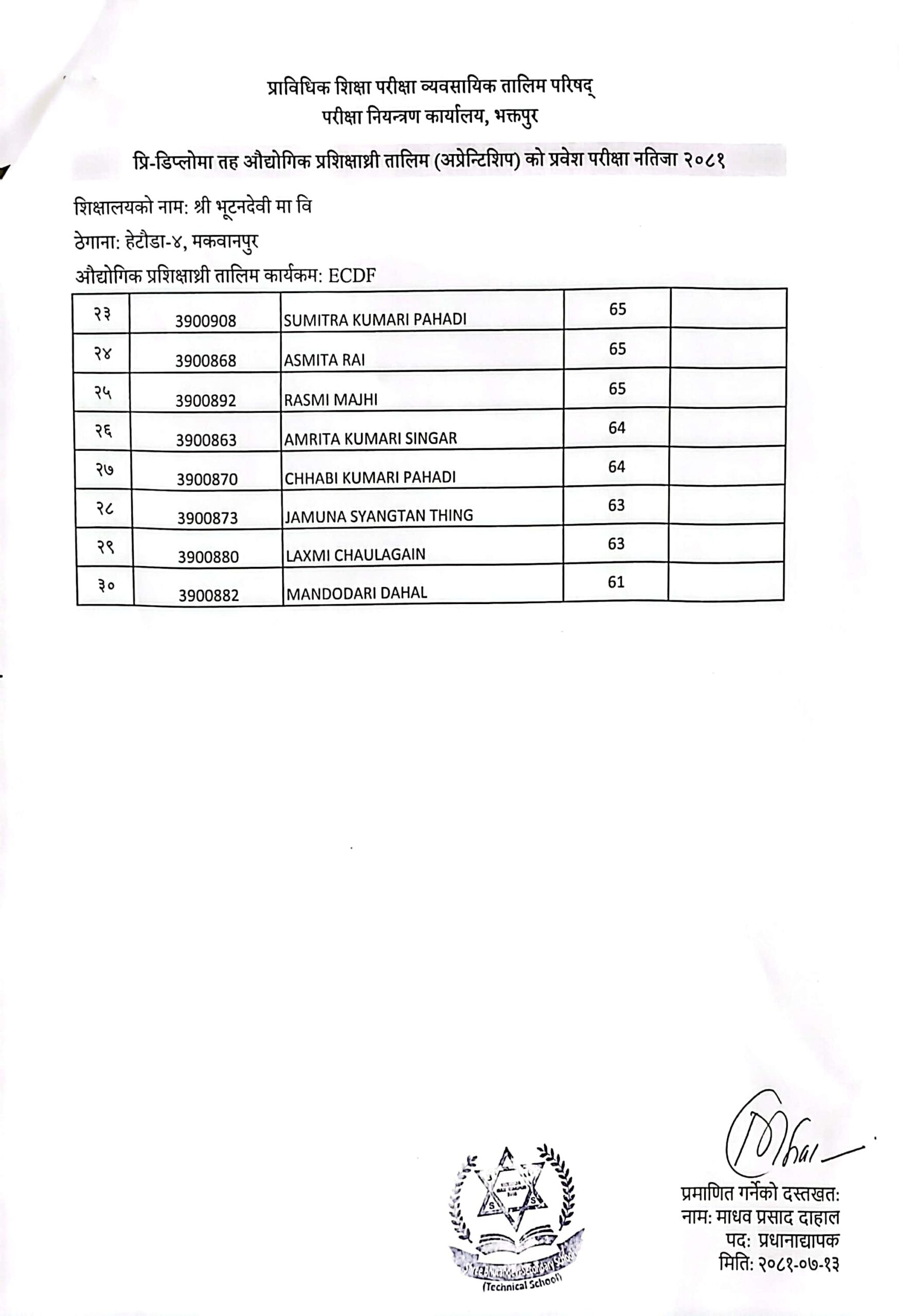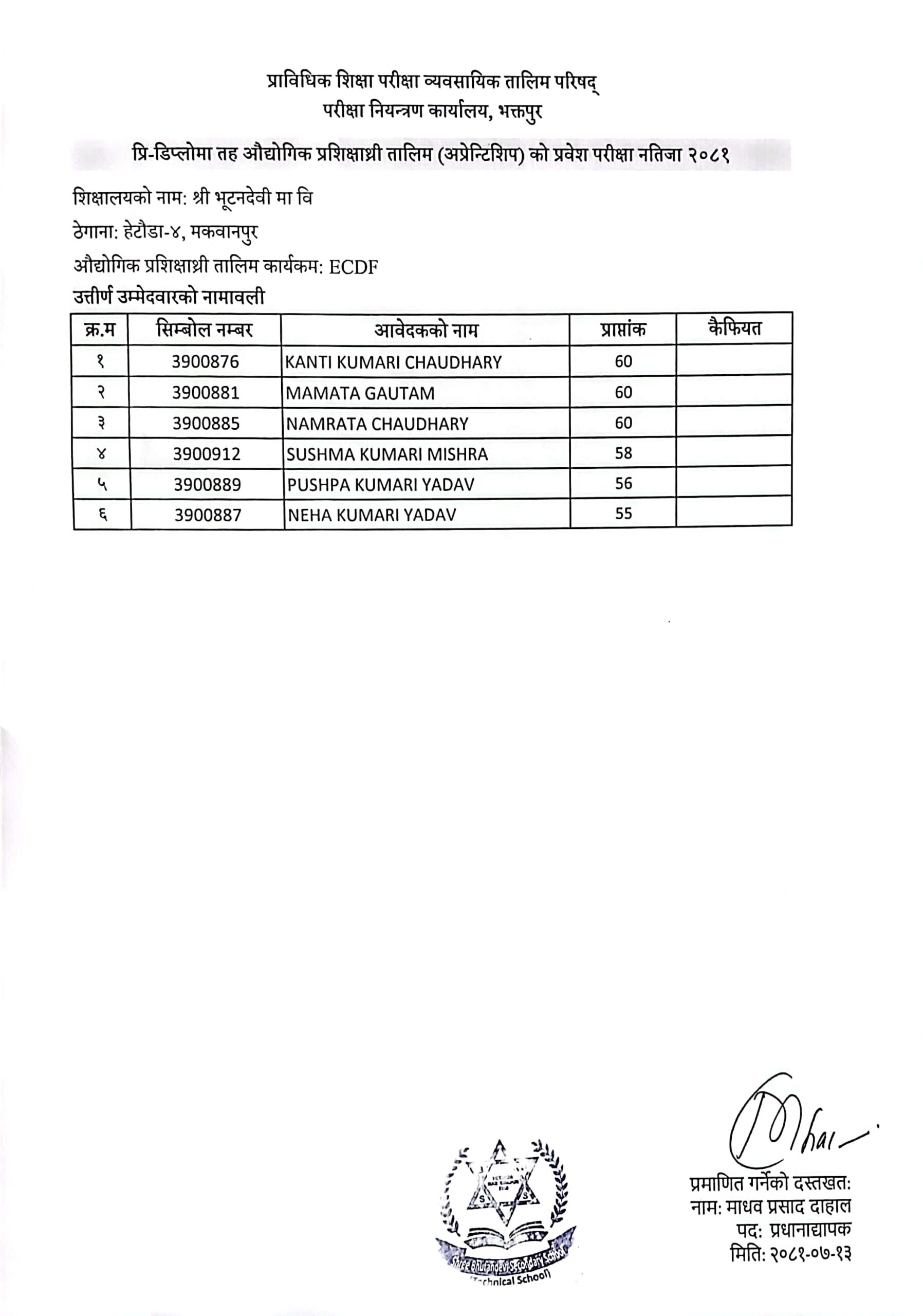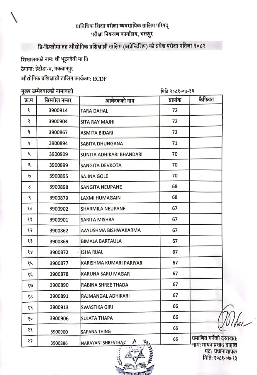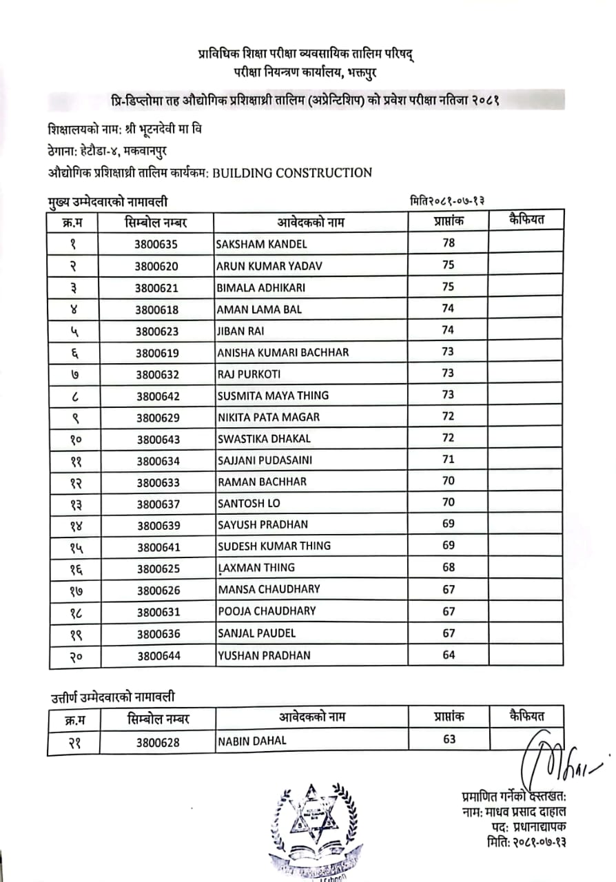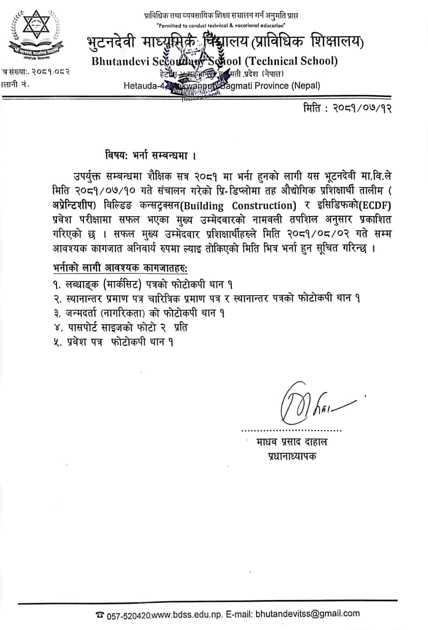 उपर्युक्त सम्बन्धमा शैक्षिक सत्र २०८१ मा भर्ना हुनको लागी यस भूटनदेवी मा.वि.ले मिति २०८१/०७/१० गते संचालन गरेको प्रि-डिप्लोमा तह औद्योगिक प्रशिक्षार्थी तालीम (अप्रेन्टिशीप) विल्डिङ कन्सट्रक्सन (Building Construction) र इसिडिएफको (ECDF) प्रवेश परीक्षामा सफल भएका मुख्य उम्मेदवारको नामवली तपशिल अनुसार प्रकाशित गरिएको छ। सफल मुख्य उम्मेदवार प्रशिक्षार्थीहरुले मिति २०८१/०८/०२ गते सम्म आवश्यक कागजात अनिवार्य रुपमा ल्याइ तोकिएको मिति भित्र भर्ना हुन सूचित गरिन्छ ।