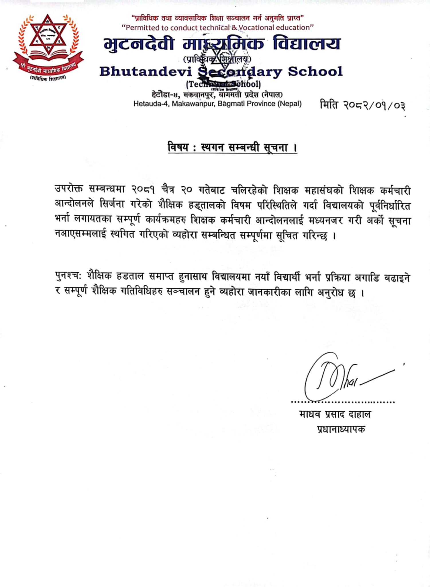 स्थगन सम्बन्धी सूचना FacebookTwitterPinterestWhatsApp RELATED ARTICLESMORE FROM AUTHOR चमेनागृह संचालन कार्यको स्वीकृतिका लागि छनौट गर्ने आशयको सूचना आवश्यकता सम्बन्धी सूचना विद्यालयमा क्यानटिन संचालनको लागि सिलबन्दी दरभाउपत्र आव्हान सम्बन्धि सूचना नविन सिग्देल, अध्यक्ष, विद्यालय व्यवस्थापन समिति admin - August 4, 2020 माधवप्रसाद दहाल, प्राचार्य, भुटनदेवी माध्यमिक विद्यालय admin - June 4, 2020 योग्य तथा अनुभवि शिक्षकशिक्षिकाहरुद्धारा अध्यापन । admin - June 1, 2020 नियमित आवधिक परिक्षा सञ्चालन तालिका । admin - June 1, 2020 खेलकुद र अन्य सहक्रियाकलापको व्यवस्था । admin - June 1, 2020 कडा शैक्षिक गुणस्तर अनुशासन कायम । admin - June 1, 2020